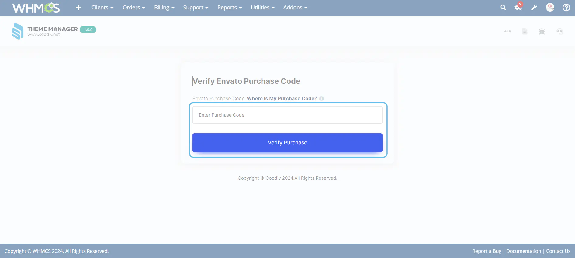 2. Entre your Purchase Code then click Verify Purchase. Read this article if you're unsure how to get the Purchase Code.