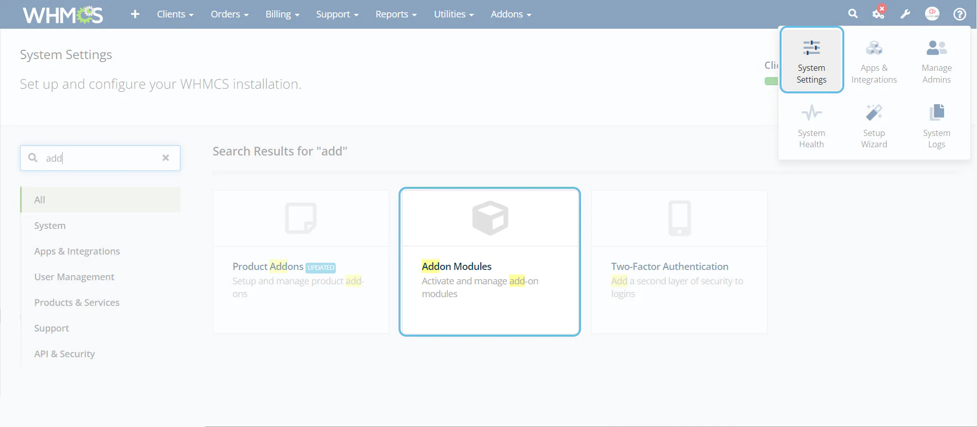 2. In the top right corner, click on System Settings then select Addon Modules.