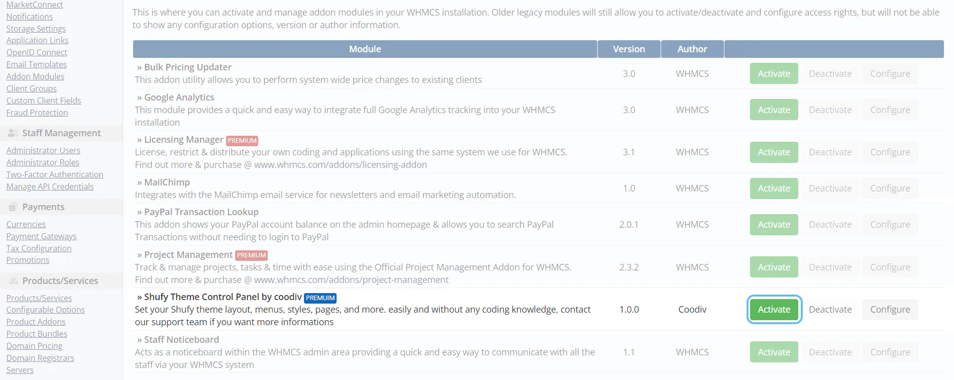 1. Go to Addons then click Shufy Theme Control Panel by coodiv in the navigation menu of your WHMCS admin area.