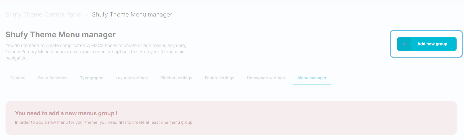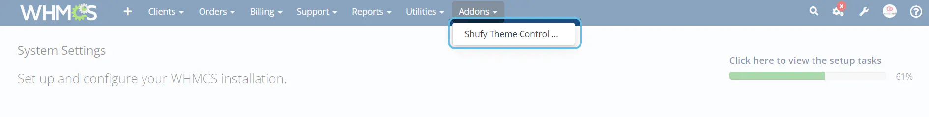 1. Go to Addons then click Shufy Theme Control Panel by coodiv in the navigation menu of your WHMCS admin area.