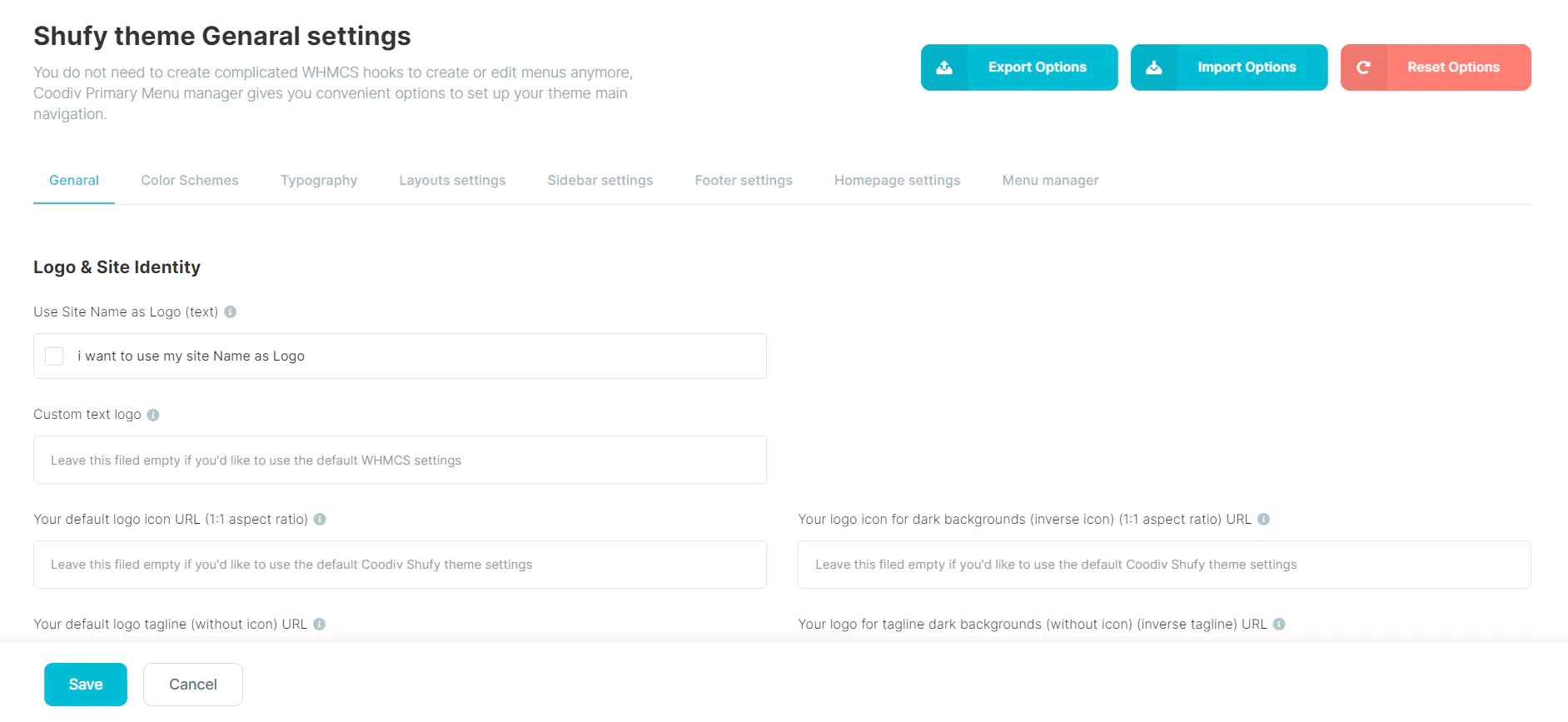 You can use the default Shufytheme logo, add your custom logo link, or even if you don't have a logo, you can still use the text logo option.
