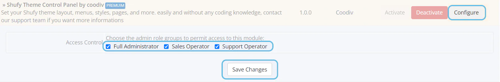 4. Click the Configure button, then select the admin role groups to grant access according to your requirements, and finally, save your changes.