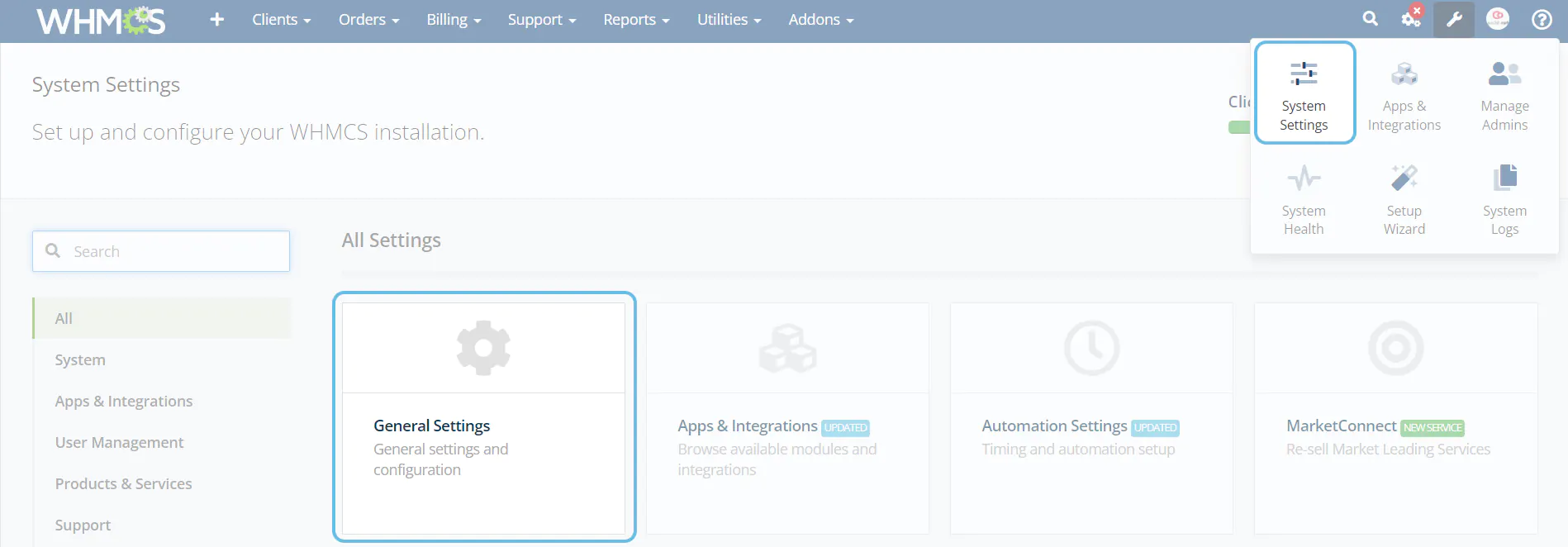 2. Clear the WHMCS template cache in: Utilities > System > System Cleanup > “Go” > “Empty Template Cache”.