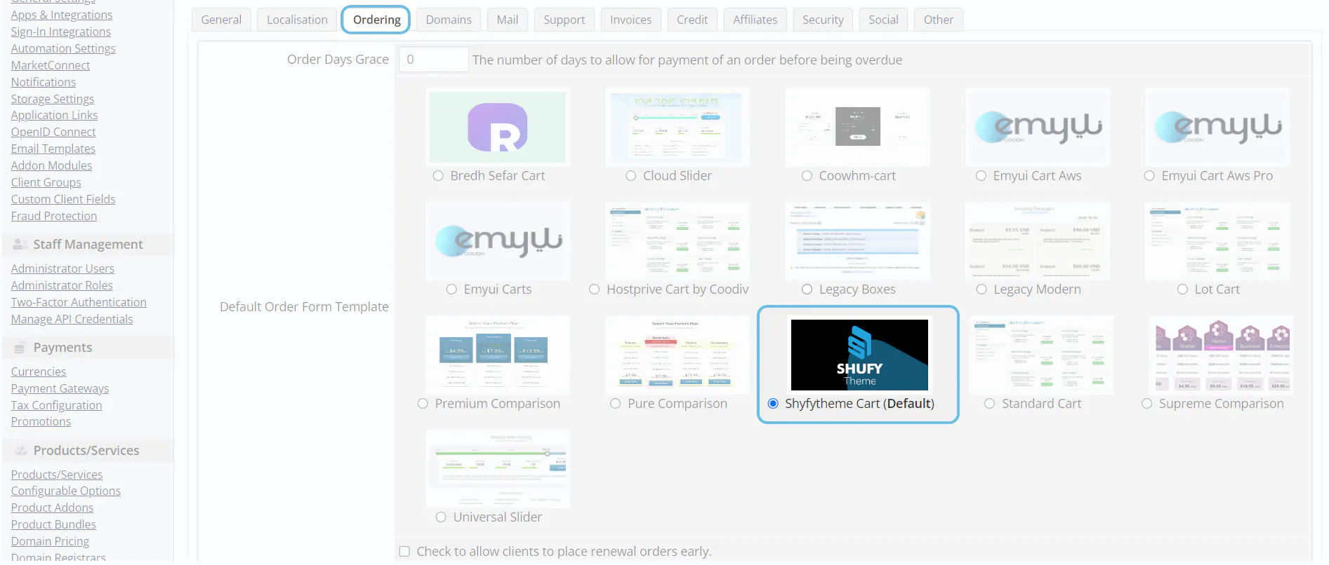 3. In Ordering tab select Shyfytheme Cart Default Order Form Template and click on Save Changes.